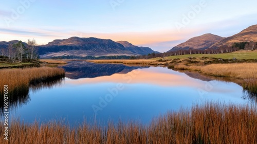 Obraz premium Gentle dawn over a secluded lake, complete with mountain reflections and soft...