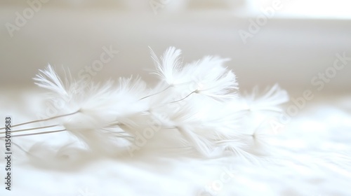 © Sukatno, Obraz premium Gentle Elegance: Close-up of Delicate White Feathers on a Light Surface