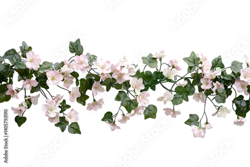 © Wawan, Fototapeta premium Gentle floral sprig with delicate blossoms in soft pink and verdant leaves against an isolated transparent background
