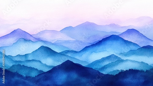 © Anak, Obraz premium Gentle, hazy mountain range depicted in shades of blue and purple.
