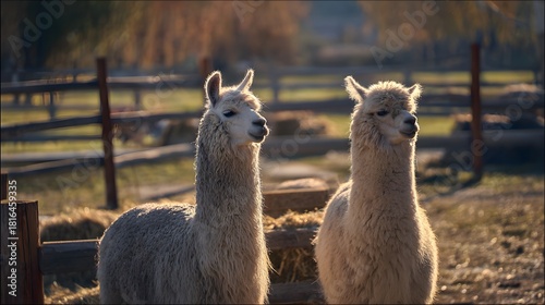 © decorator, Obraz premium Gentle llamas graze peacefully within a sunlit farm enclosure serene rural wildlife scene