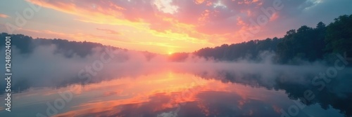 © AiGallery, Naklejka premium Gentle mist rising from the lake as sunset approaches, sky, mist, water