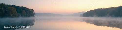 Fototapeta premium Gentle morning mist rises from a serene lake scene, mist, morning, lake