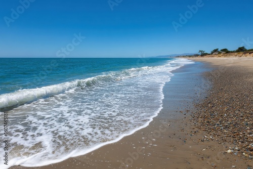 Obraz premium Gentle ocean waves kissing a pebble beach under a clear blue summer sky