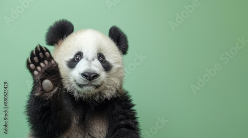 Fototapeta premium Gentle Panda Raising Its Paw in a Welcoming Gesture, Set Against a Soft Green Background