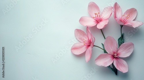 Fototapeta premium Gentle pink flowers arranged on a soft light blue backdrop, creating a tranquil and minimalist composition with copy space