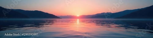 © PHOUVONG , Obraz premium Gentle ripples disturb the lake's calm surface at dusk, calm,