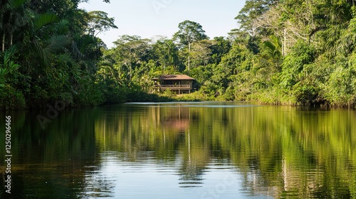 Fototapeta premium Gentle River Flowing Through the Rainforest with Clear Water Reflecting Trees and a Peaceful Atmosphere