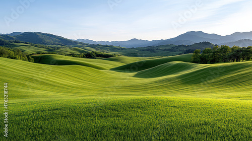 Fototapeta premium Gentle rolling hills with vibrant green grass under morning light create...