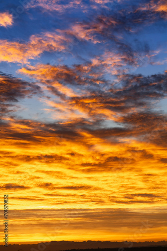 © Pi-R, Obraz premium Gentle Sky at Sunset Sunrise with real sun and clouds. Real sunset sky, colorful sky during sunset or sunrise, weather, colorful colors of the sky