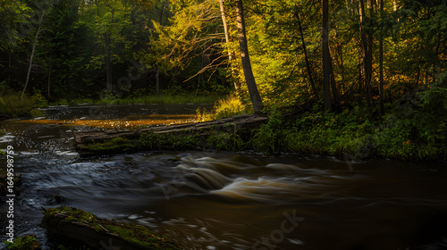 Fototapeta premium Gentle stream flowing through a lush green woods, inviting peace and...