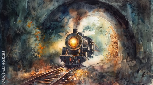 Naklejka premium Gentle watercolor of a steam train emerging from a tunnel, the headlight...