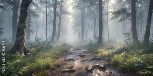 © Kachaphot, Naklejka premium Gentle watercolor strokes on a misty morning forest floor , foliage, leaves, texture