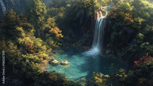 © Alicea, Obraz premium Gentle Waterfall Flowing into Tranquil Pool