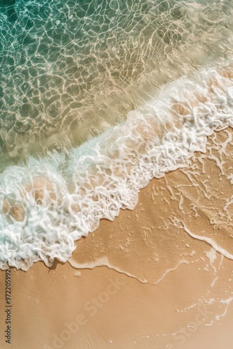 © Alexandra Selina, Naklejka premium Gentle waves lapping at the sandy shoreline in bright daylight at the beach. Vertical natural background.