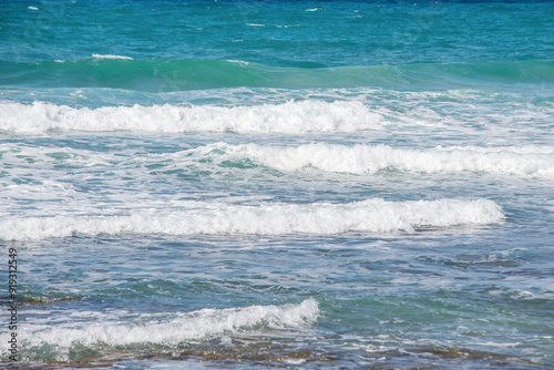 © Iryna, Fototapeta premium Gentle waves lapping on serene beach under bright sun in tropical paradise