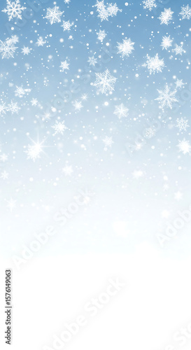 © AssetBud, Fototapeta premium Gently falling snowflakes create a winter wonderland atmosphere with a soft, light blue background, suggesting a calm and serene festive season perfect for holiday cheer and seasonal greetings.