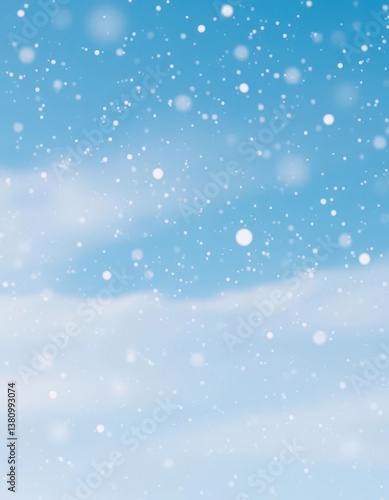 Fototapeta premium Gently falling snowflakes drift over a serene, expansive blue winter sky,...