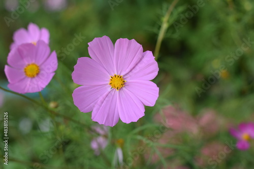 © Ирина Кабанцева, Fototapeta premium Gently lilac kosmeya on a green background. Summer. Bloom
