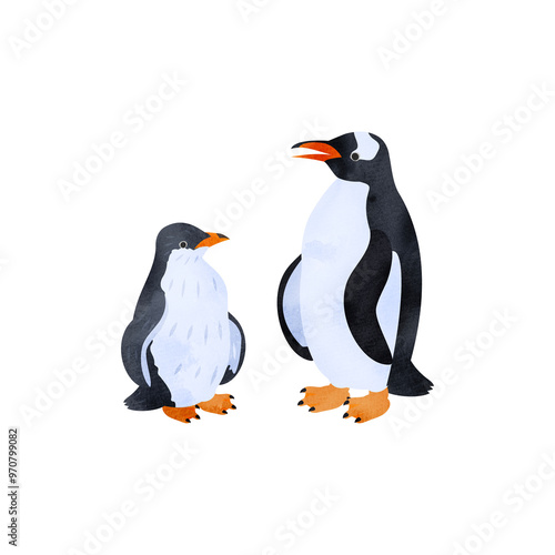 Fototapeta premium ジェンツーペンギンの雛と成鳥。水彩風イラスト。 Gentoo penguin chick and adult. Watercolor style...