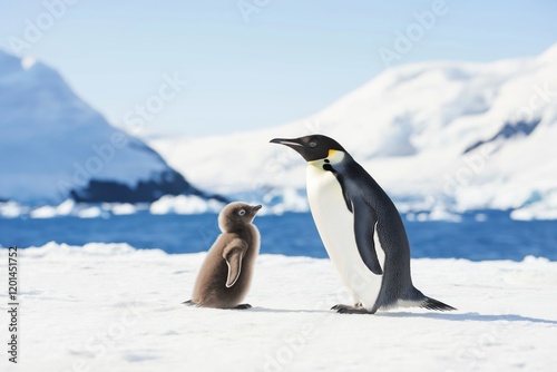 Fototapeta premium Gentoo penguin chick interacts with parent at Petermann Island, Antarctic...