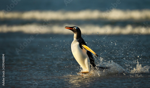 Naklejka premium Gentoo penguin coming ashore from stormy ocean