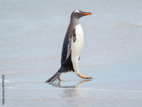 Fototapeta premium Gentoo penguin coming ashore on a sandy beach in the Falkland Islands in January.