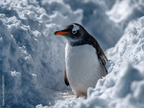 © Jack, Fototapeta premium Gentoo Penguin in deep snow. Antarctica, Antarctic Peninsula, Wiencke Island.