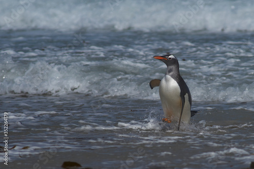 Fototapeta premium Gentoo Penguin (Pygoscelis papua) coming ashore at The Neck on Saunders Island in the Falkland Islands.