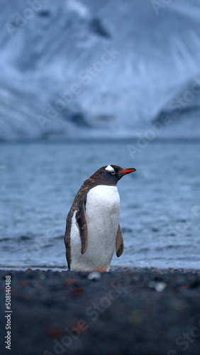 Naklejka premium Gentoo penguin (Pygoscelis papua) on the beach at Whaler's Bay, Deception...