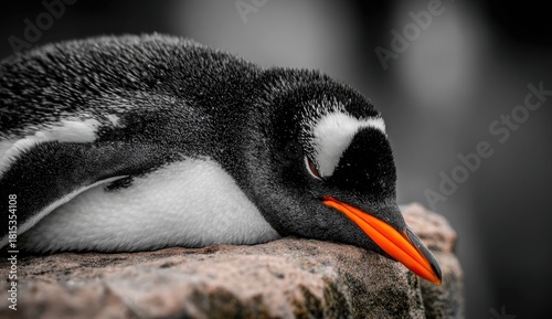 Naklejka premium Gentoo penguin rests its head on a rock with eyes closed.