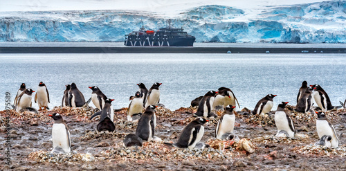 Fototapeta premium Gentoo Penguin rookery Yankee Harbor Greenwich Island Antarctica.