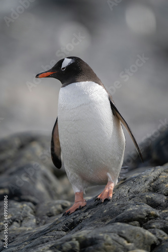 Fototapeta premium Gentoo penguin stands balancing on rocky beach