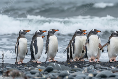 © Olena, Fototapeta premium Gentoo penguin stands on rocky shoreline with waves crashing in the background