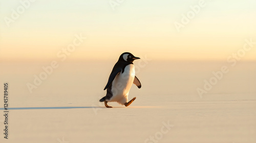 Fototapeta premium Gentoo penguin strolling through a snow-covered winter landscape against a...
