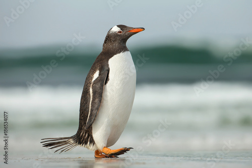 Fototapeta premium Gentoo penguin walking on a sandy ocean shoreline, Falkland Islands.