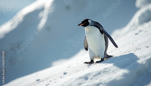 © Vadym, Fototapeta premium Gentoo penguin walking on a snowy slope, turning its head. This monochrome bird is isolated in its natural cold winter habitat. The image captures the creature movement across the icy terrain.