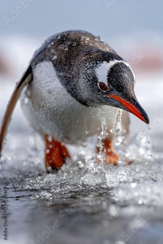 Fototapeta premium Gentoo penguin walks over icy water, splashing droplets in a natural habitat...