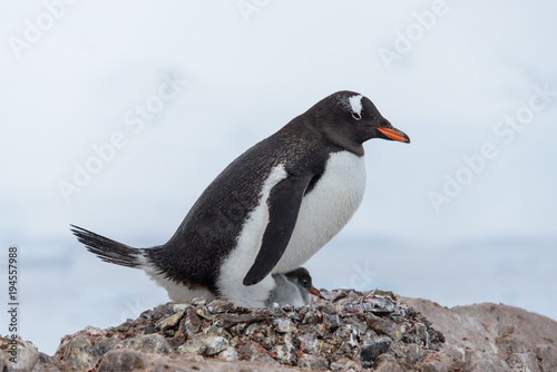 © Alexey Seafarer, Naklejka premium Gentoo penguin with chicks in nest