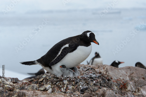 © Alexey Seafarer, Naklejka premium Gentoo penguin with chicks in nest