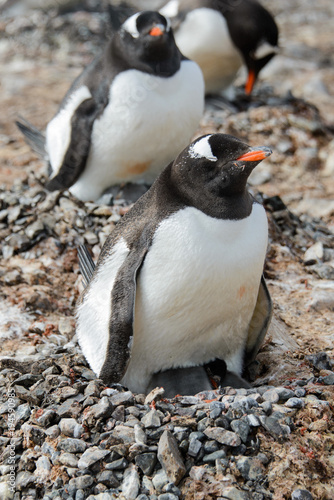 © Alexey Seafarer, Naklejka premium Gentoo penguin with chicks in nest