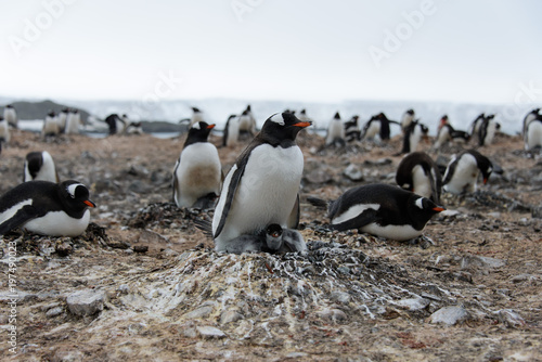 © Alexey Seafarer, Naklejka premium Gentoo penguin with chicks in nest