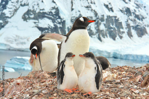 Obraz premium Gentoo penguins in nests with chicks in Antarctica