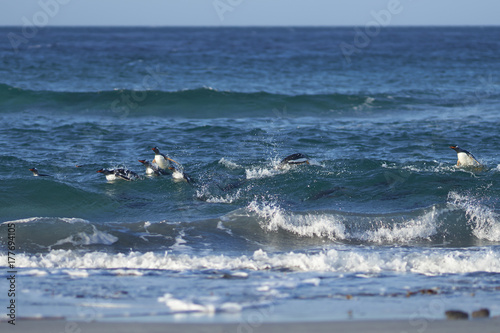 Obraz premium Gentoo Penguins (Pygoscelis papua) coming ashore after feeding at sea on Sea Lion Island in the Falkland Islands.
