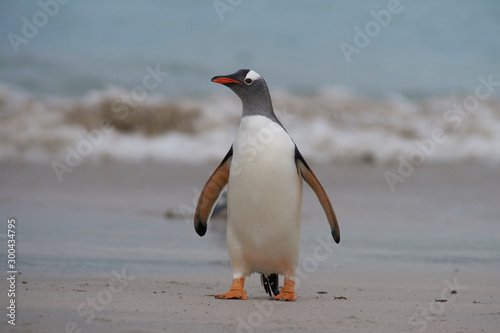 Naklejka premium Gentoo Penguins (Pygoscelis papua) coming back to land after a day spent feeding at sea. Bleaker Island in the Falkland Islands.