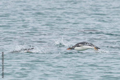 Fototapeta premium Gentoo Penguins (Pygoscelis papua) surfing in the sea off the coast of Sea...