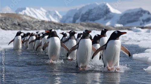 Fototapeta premium Gentoo penguins waddle through shallow water with icebergs in the background...