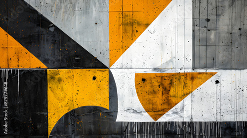 © practice , Naklejka premium Geometric abstract in black and white with textured details and yellow accents, showcasing stark contrasts and yellow splashes over an angular backdrop.