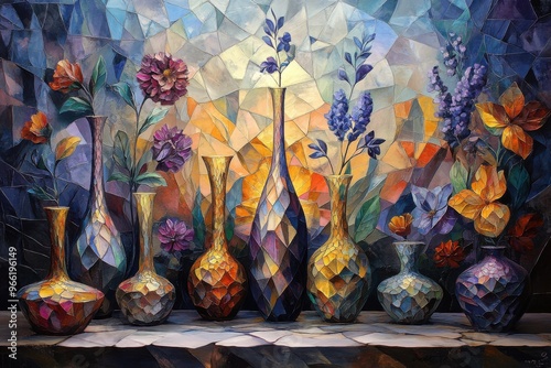 Fototapeta premium Geometric art with river and flowers in abstract painting vibrant design for wall decor
