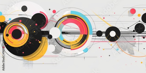 © Tunsale, Obraz premium Geometric Background with Colorful Circles and Lines on Black and White. AI generated illustration